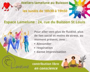 Stage ouvert à toutes et tous quel que soit votre état physique et émotionnel, dans l’accueil et la bienveillance. Nous finirons par un temps de danse improvisée en douceur sans oublier notre fameux moment de convivialité partagé autour d’une boisson chaude.